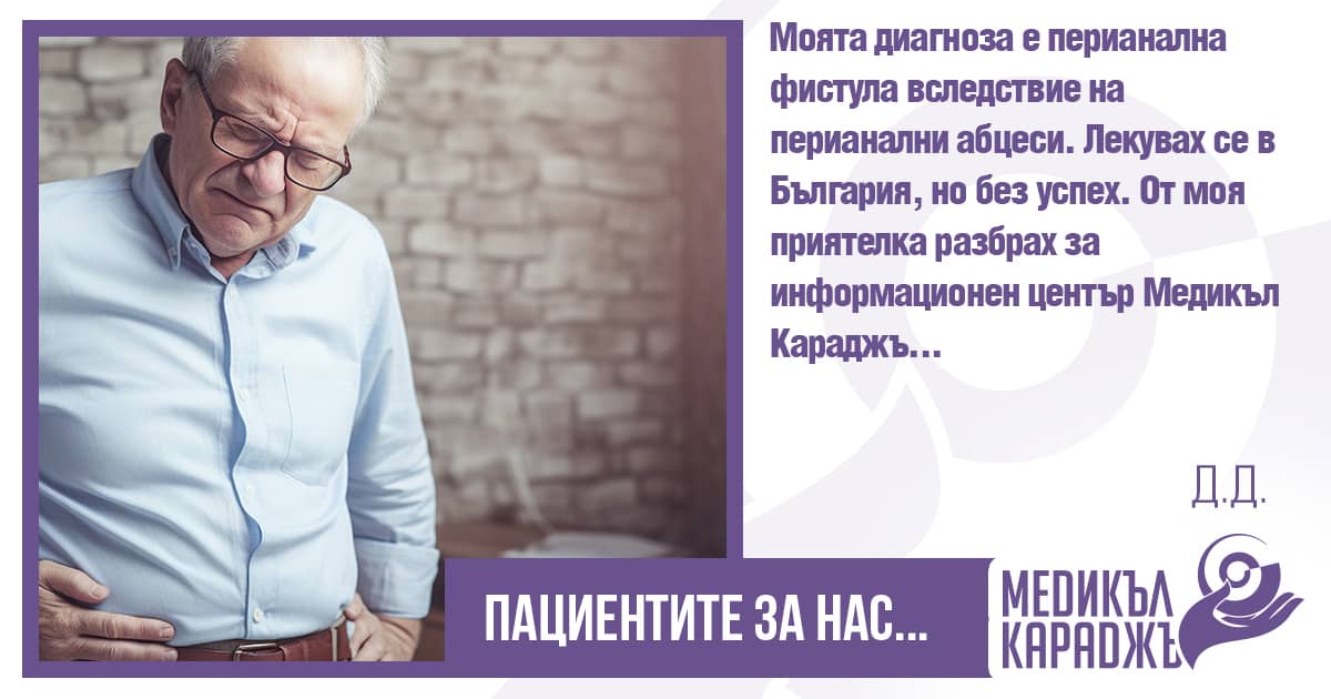 Моята диагноза е перианална фистула вследствие на перианални абцеси. Лекувах се в България, но без успех. От моя приятелка разбрах за информационен център Медикъл Караджъ и се свързах със Звезделина Лютфи. Тя направи запитване до няколко турски болници и се спряхме на болница Мемориал Бахчелиевлер Истанбул.