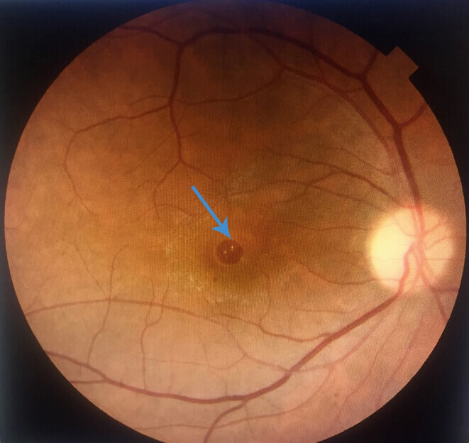 Il foro retinico al centro della macula (freccia) è visibile in una fotografia a colori di un paziente con foro maculare.