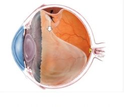 La trazione della retina da parte del gel vitreo (freccia bianca) causa il distacco della retina. Il fluido vitreo che scorre attraverso l'area rotta (freccia nera) verso lo spazio sotto la retina provoca il distacco di quest'ultima.