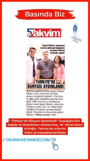 Evgeni Nikolov (48), residente in Bulgaria, ha perso l'occhio sinistro 20 anni fa a causa di un incidente. 10 anni fa l'altro occhio è diventato cieco a causa di una malattia. Nikolov, che per anni ha desiderato il volto della moglie e dei figli, è venuto in Turchia per farsi curare. Dopo gli interventi chirurgici di successo dell'Assoc. Prof. Dr. Hasan Basri, Arifoglu è guarito. "C'era un mondo", disse Nikolov, vedendo di nuovo, anche se con un occhio solo".
